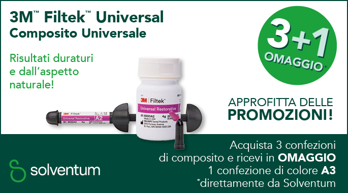 FILTEK UNIVERSAL RESTORATIVE SYR ric.A3 4gr 6555A3 3M–Espe Otto colorazioni specifiche. Un'opacitą universale. Non poteva essere pił semplice.Si inizia con una selezione semplificata del colore. Solo 8 colori specifici pił un Extra White (XW) per coprire tutti i 19 colori della scala VITA e bleach.* Inoltre, i colori hanno un'opacitą universale che soddisfa la maggior parte delle esigenze cliniche. La tecnologia NaturalMatch (basata su nanoriempitivi, esclusivi monomeri a basso stress e pigmenti) permette all'estetica monomassa di armonizzarsi in modo pił naturale con la dentizione. I pigmenti fluorescenti migliorano l'aspetto naturale. La tecnologia del riempitivo 3M permette una maggior radiopacitą.Innovazioni di colore come l'Extra White (XW) e un Pink Opaquer (PO) sono state pensate per aiutarvi a realizzare restauri dall'estetica eccellente in ogni situazione. Indicazioni: Restauri diretti anteriori e posteriori (comprese le superfici occlusali); Ricostruzioni di moncone; Splintaggi; Restauri indiretti, come inlays, onlays e faccette
